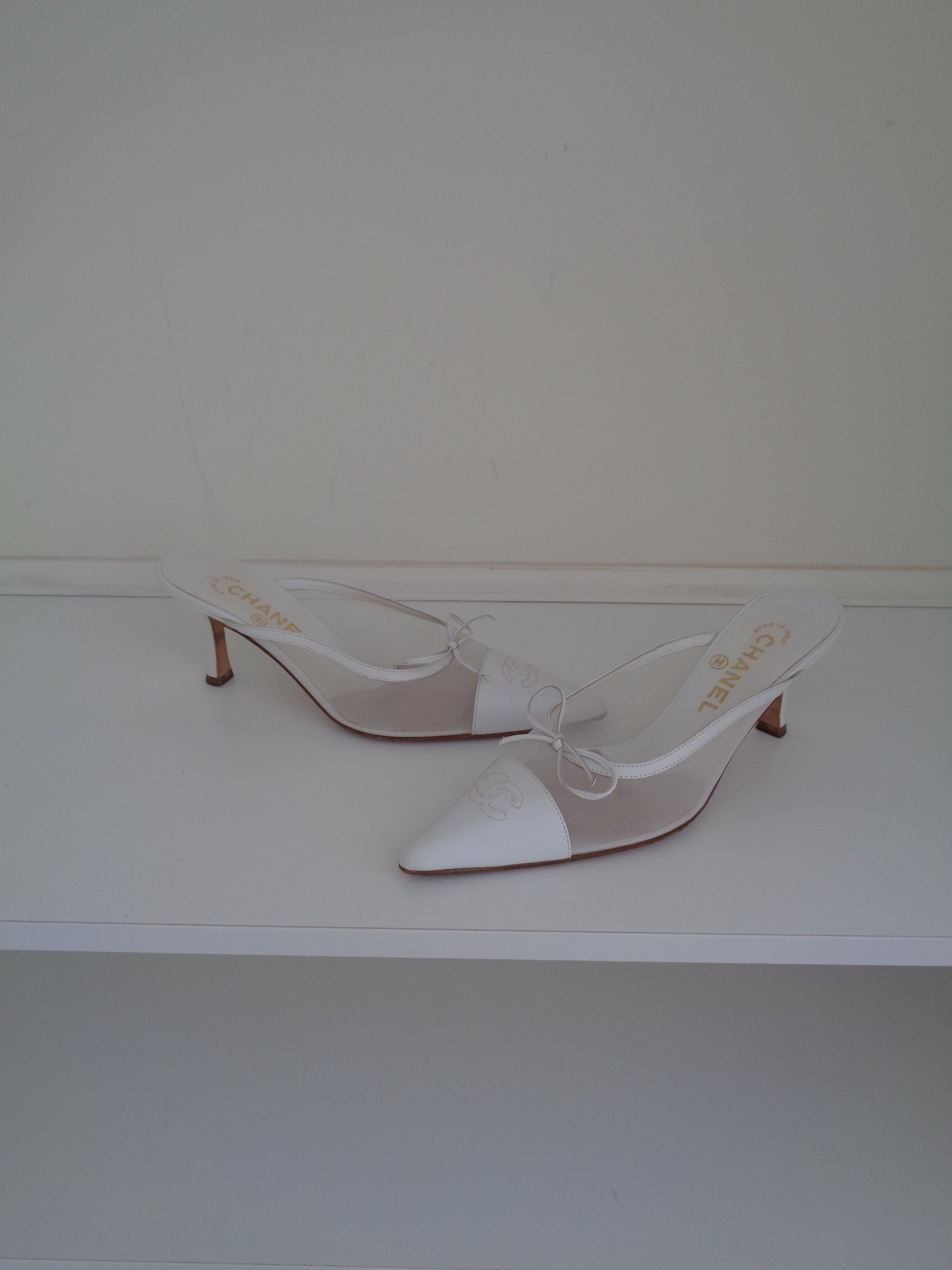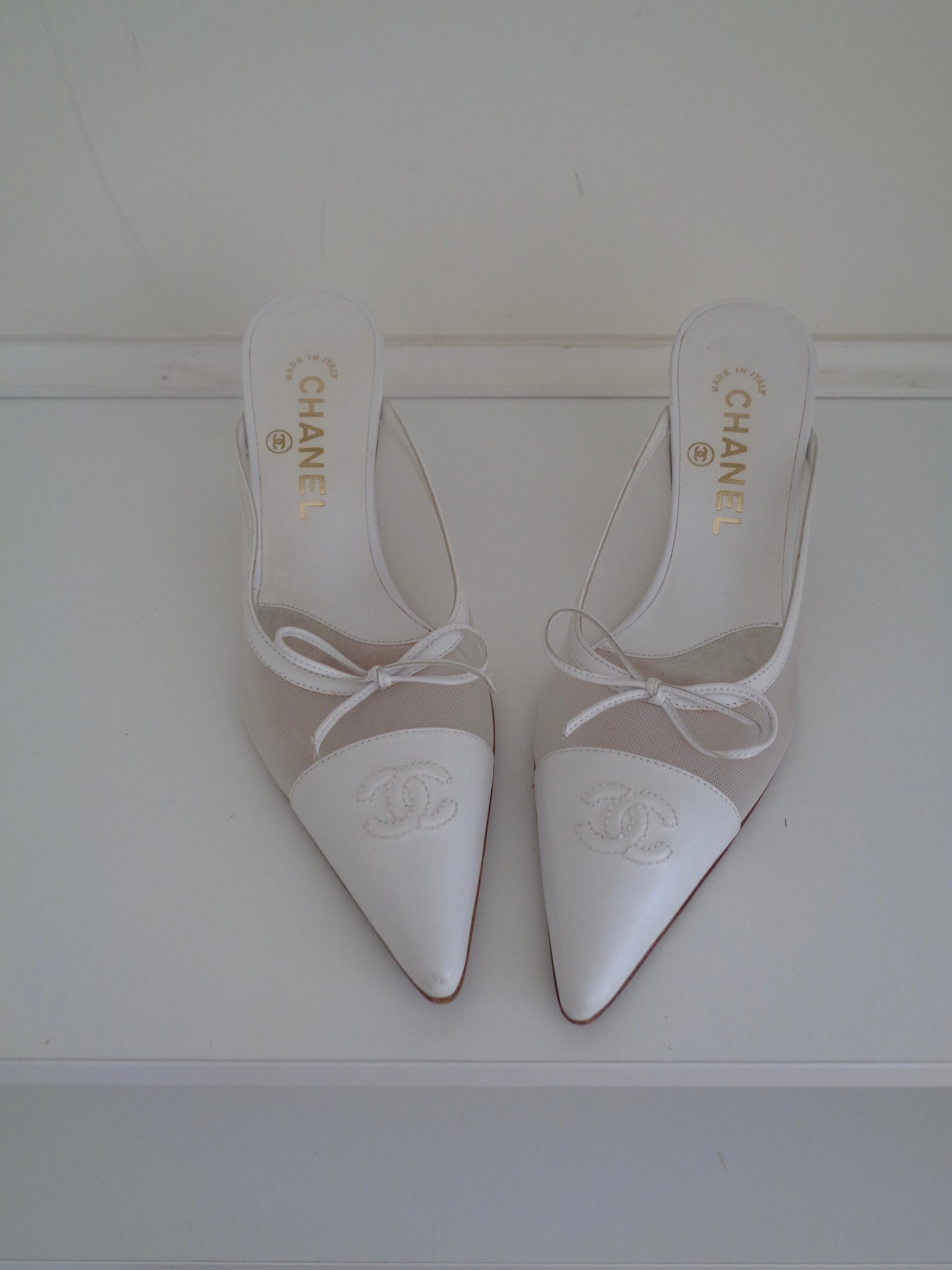 Very rare vintage Chanel CC white mesh knit mules, with leather toe cap. The essential white pair of heels for your summer wardrobe.
