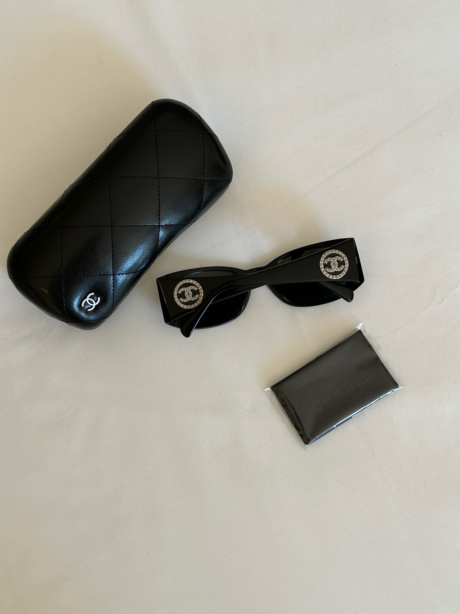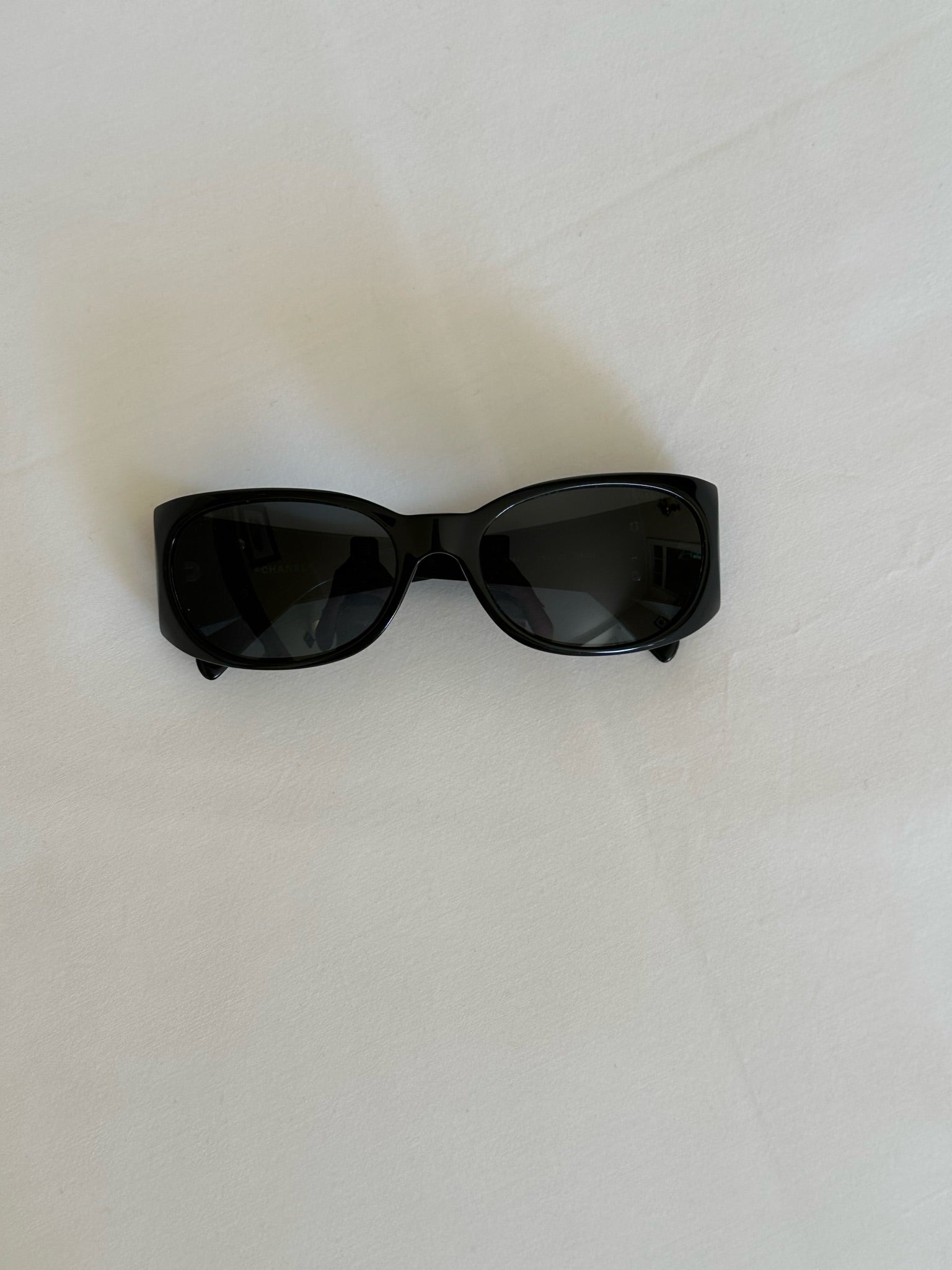 Vintage black Chanel sunglasses with pearl detailing. The perfect black pair of sunglasses, a statement piece. The original Chanel case is included.